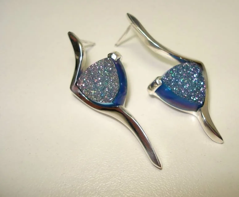 This is the first in it’s series, each set of earrings is made with artistic edge, Each piece is different, yet an undeniable synergy exists. Drusy “Lilac Ice” Agates set in Sterling Silver.